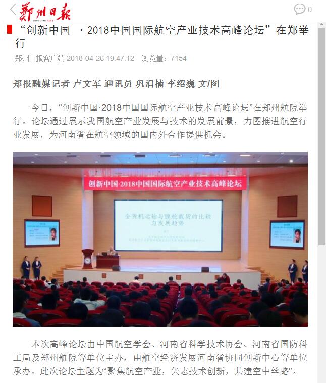 4月26日,郑州日报客户端、科学网报道在我校举办的 “创新中国·2018中国国际航空产业技术高峰论坛”。