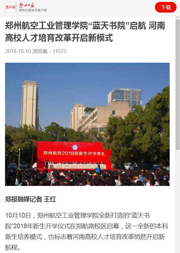 10月10日,我校举行南校区2018级新生开学典礼。郑州日报、郑州晚报、东方今报相关记者到校采访报道,学校书院制办学改革倍受关注。11日,《郑州晚报》以“河南高校开启人才培养新模式 郑州航院蓝天书院迎来首届本科生”为题进行报道。
