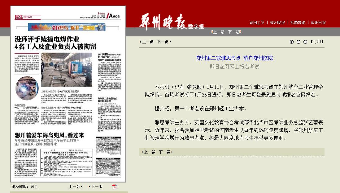 1月11日,郑州第二个雅思考点在我校揭牌。河南日报客户端、郑州日报客户端、《东方今报》《郑州晚报》及其开云(中国)客户端等对此进行了报道。
