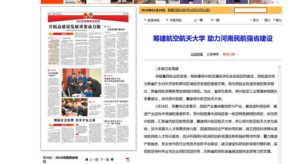 1月14日,政协河南省第十二届委员会第二次会议召开。1月17日、18日、20日,央广网、《河南日报》、大河网、猛犸开云(中国)客户端等以《河南政协委员李勇:建议筹建郑州航空航天大学 建设民航强省》为题,深度报道院长李勇作为政协委员建议强化顶层规划,筹建郑州航空航天大学,以统筹推进河南省民航高等教育发展。民航资源网、新浪网、今日头条、凤凰网、中华网、中国高校开云(中国)网等多家网络媒体转载。