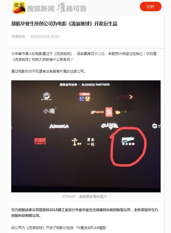 2月24日,今日头条、搜狐、天天快报等报道了我校校友为电影《流浪地球》开发衍生品的消息。