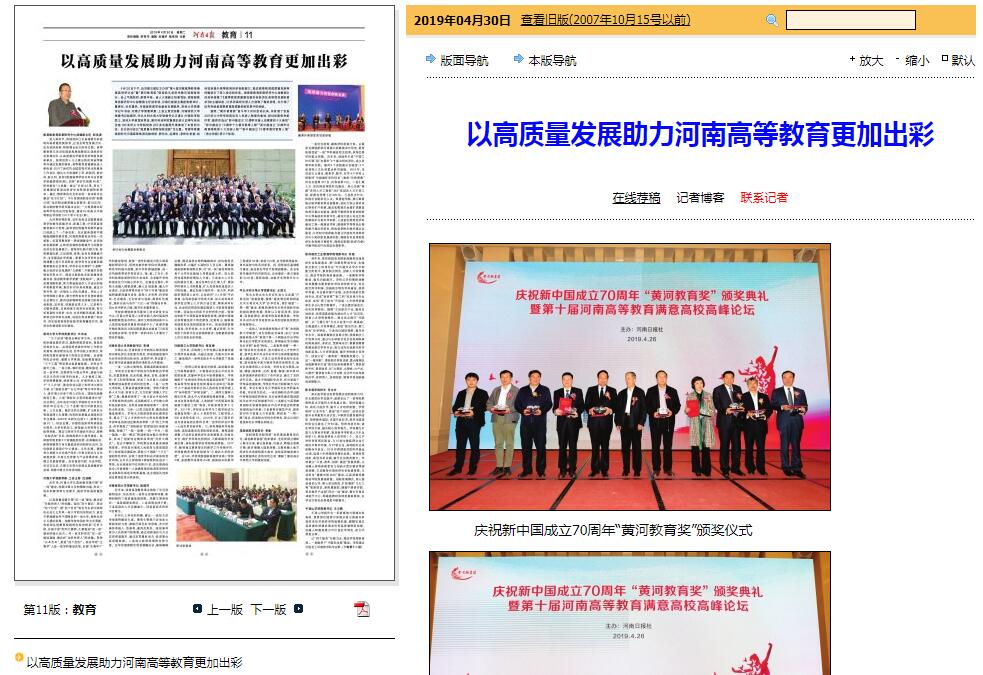 近日,《河南日报》“第十届河南高等教育满意高校研讨会”暨“黄河教育奖”颁奖典礼进行了详细报道。在“黄河教育奖”评选活动中,我校党委书记付强荣膺“新中国成立70周年十大黄河教育人物”,我校获评“新中国成立70周年河南高等教育十大杰出贡献单位”与“新中国成立70周年河南最具国内就业竞争力的高校”。