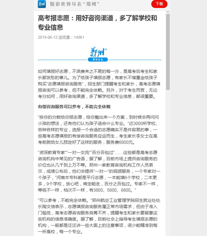 近日,郑报全媒体记者采访我校招生就业处处长陶文信,为考生支招志愿填报。陶文信提醒考生,用好咨询渠道,多了解学校和专业信息。相关报道于6月12日在郑州日报客户端、郑州晚报客户端上发布。