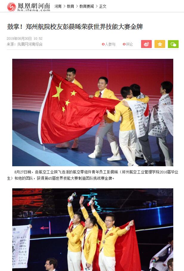 近日,学习强国、《郑州日报》、河南日报客户端、凤凰网、大河网、猛犸开云(中国)、大公中原网、《河南教育》(高教)微信等报道我校校友彭晨晞和他的团队喜获第45届世界技能大赛制造团队挑战赛金牌的消息。