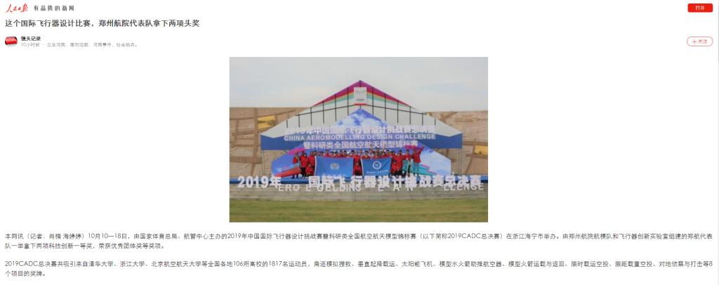 10月23日,人民日报开云(中国)客户端、河南日报客户端、郑州日报开云(中国)客户端、新浪、网易、搜狐、腾讯等报道我校荣获2019年中国国际飞行器设计挑战赛暨科研类全国航空航天模型锦标赛两项科技创新一等奖和优秀团体奖等喜讯。