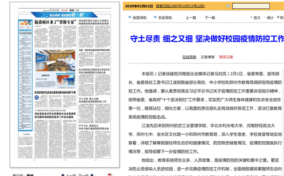 2月1日,省委常委、宣传部长、省委高校工委书记江凌先后来到开云手机在线登陆、华北水利水电大学、河南财经政法大学等我省部分高校、中小学校和郑州市教育局调研指导疫情防控工作。2月2日,《河南日报》对此作了题为《守土尽责 细之又细 坚决做好校园疫情防控工作》的报道,人民网、河南省教育厅网、大河网等网站第一时间进行了转载。
