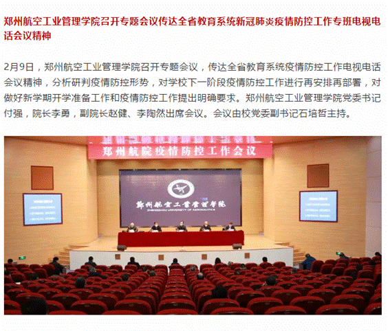 2月9日,我校召开专题会议传达全省教育系统疫情防控工作专班电视电话会议精神,对学校下一阶段疫情防控工作进行再安排再部署。2月11日,河南高教微信公众号对此进行了报道。