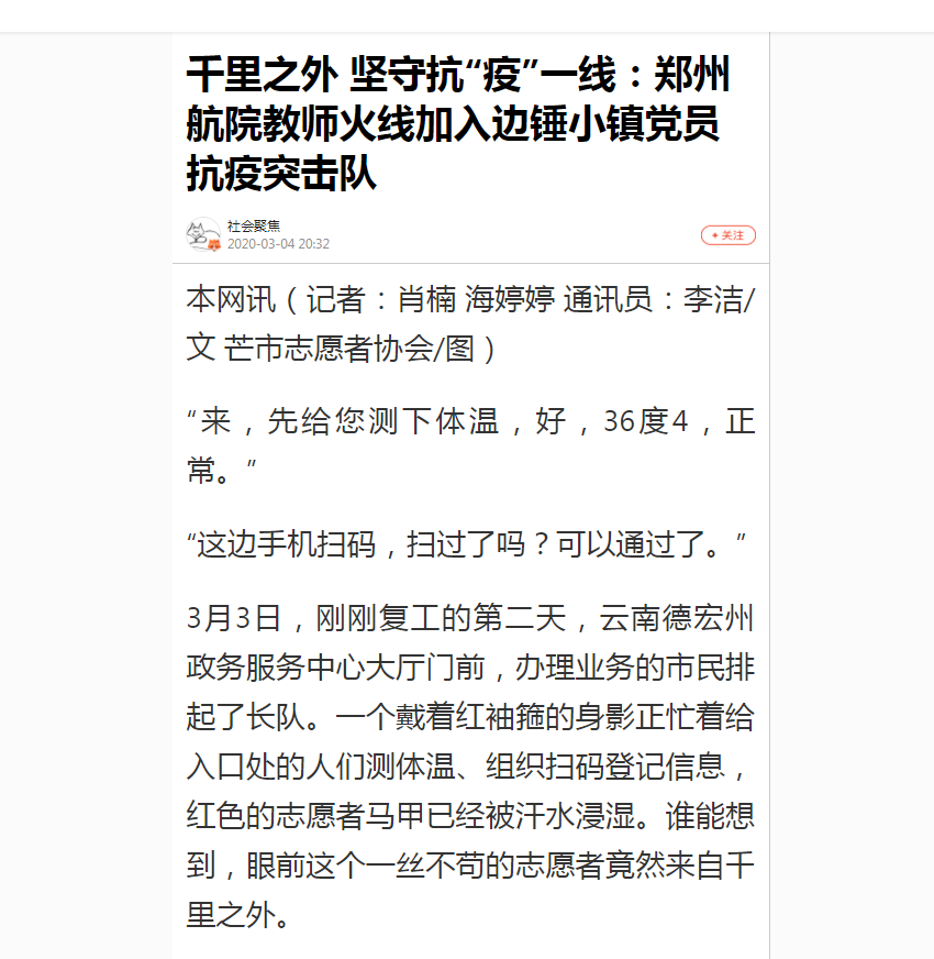 近日,今日头条、搜狐等报道我校教师、57岁的老党员许劲波加入云南德宏州芒市党员抗疫突击队,助力当地疫情防控的事迹。