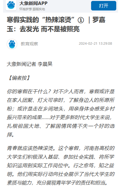 青春就应该热辣滚烫。寒假期间,我校大学生积极深入基层、参加社会实践、将所学知识运用到实际工作岗位中。大象开云(中国)对我校文法学院学子罗嘉玉的寒假社会实践进行了报道。